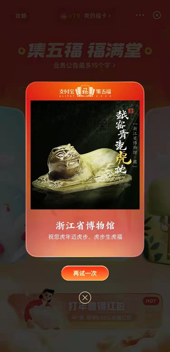 用户在参与集福过程中,可随机获得这张特别的浙博文物福卡,点击福卡还可以查看浙博的介绍和虎枕的历史典故,感受来自浙江省博物馆的浓浓新春祝福。