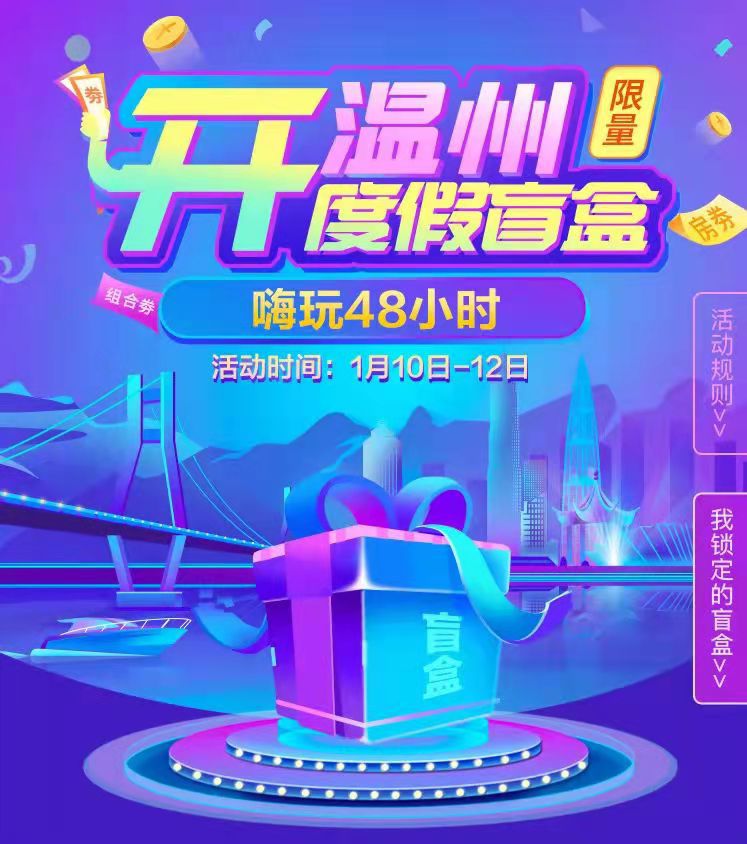 “嗨玩温州48小时,只需要一个盲盒。” 1月10日至12日,全省首发温州度假盲盒在线上开售,经过新媒体、公众号、OTA平台推送及消费者热情转发曝光,活动总曝光量在1000万人次以上,每个时间段的盲盒都是在较短的时间内一抢而光,为今年节前温州旅游市场预热和激活了一把。本次盲盒活动的火爆也为今年春节温州文旅市场营销提供了“能量”,进一步助推温州国家文化和旅游消费试点城市建设。