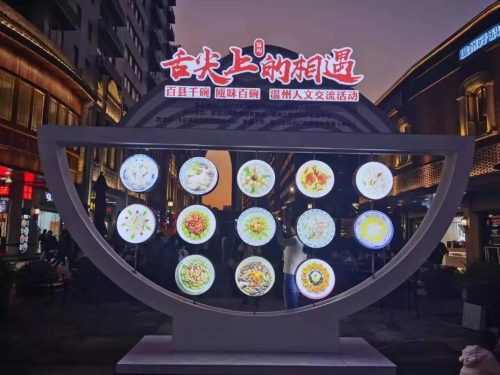 本次活动以“舌尖上的相遇”为主题,共展出“百县千碗长桌宴美食展”、“温州各县(市、区)特色小吃展卖”、“温州特色文创商品展卖”、“温州旅游美图展”四大板块内容。蓝颊缬花布铺就的长桌宴上,楠溪江长寿宴、文成伯温家宴、乐清状元宴、瓯海纸农菜等各县(市、区)特色宴席一字排开,看到精致的菜品像艺术品,很多市民点赞拍照;温州特色小吃展卖摊位前,簇拥的市民争前恐后购买鹿城阿红鱼丸,品尝泰顺绿豆腐;各地文创商品展卖摆出的产品精致、创意,雁荡山画院的文创衍生品、瑞安的蓝颊缬、平阳的温州蛋画、洞头的东海贝雕等吸引很多市民驻足围观和选购。温州八中前展出的“温州旅游美图展”则让更多的市民从不同的视野看见“诗画山水,温润之州”的大美风光。