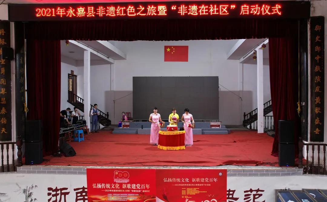 2020年10月,温州市被文旅部列入“非遗在社区”试点城市之一,以促进非遗在城市社区广泛传承传播,为保护、传承、发展非遗文化凝聚新力量。近年来,永嘉县非遗保护工作取得了丰硕成果,此次非遗红色之旅活动暨“非遗在社区”工作启动仪式,旨在庆祝中国共产党成立100周年,进一步弘扬爱国主义精神和中华优秀传统文化,加快构建非遗在社区、在家庭“微生态”,努力营造社会参与非遗保护良好氛围。