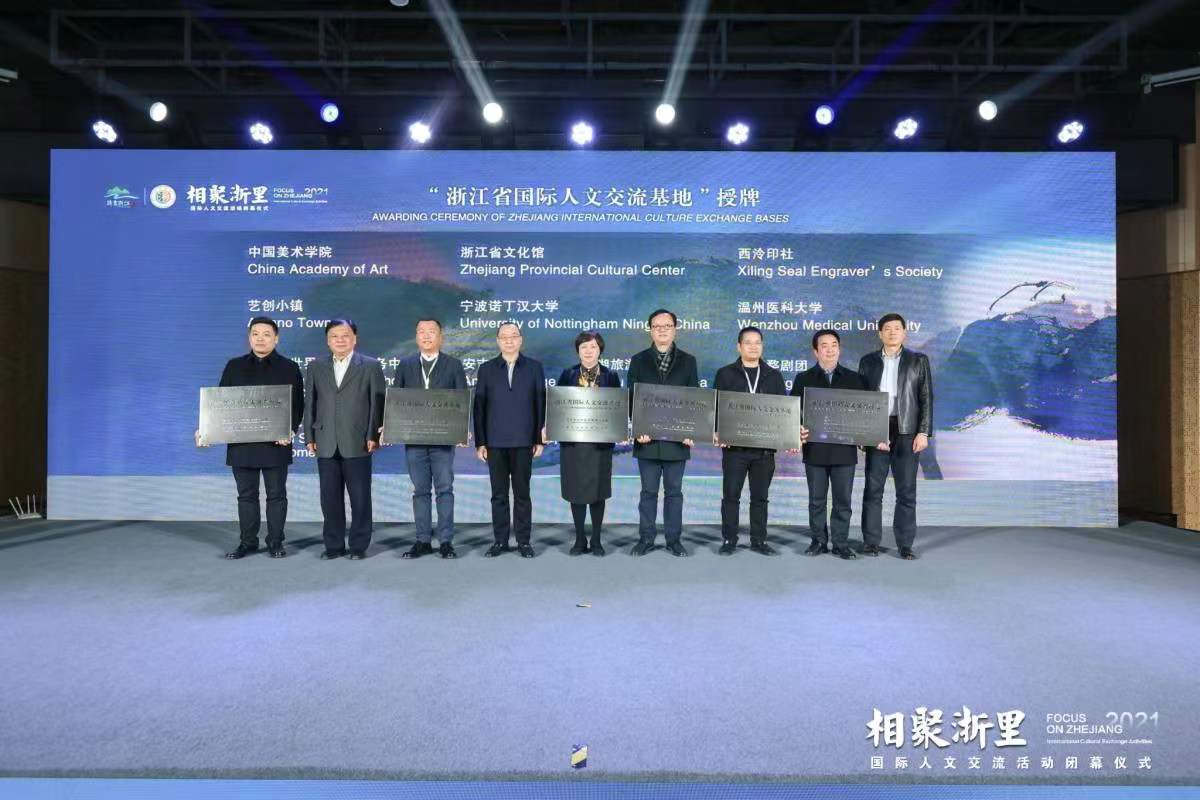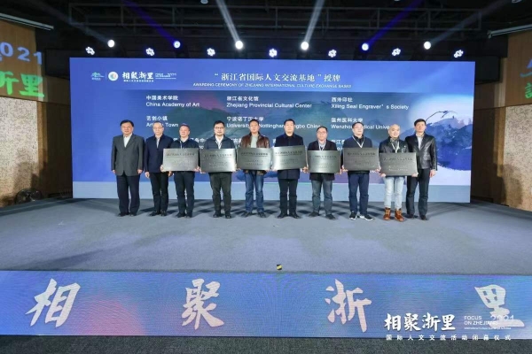 2021“相聚浙里”国际人文交流活动闭幕仪式上,还为中国美术学院、浙江省文化馆、西泠印社、艺创小镇、宁波诺丁汉大学、温州医科大学、温州市世界温州人服务中心、安吉县余村、南湖旅游区、浙江婺剧艺术研究院(浙江婺剧团)、衢州南孔文化发展中心、天台和合人间文化园、缙云县仙都风景旅游区共13家浙江省国际人文交流基地颁牌。从2020年6月开始,浙江省政府新闻办、浙江省文化和旅游厅联合开展了省国际人文交流基地培育建设工作。目前有二批共20家单位被授予省级国际人文交流基地称号。