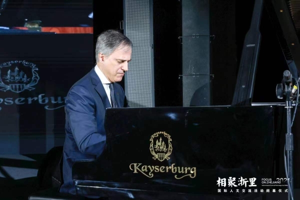 “诗画浙江”友好使者、来自意大利的著名钢琴家乔万尼·维塔莱蒂和刘涛为现场观众联袂演绎了罗西尼歌剧《塞维利亚的理发师》选段《快给大忙人让路》,这是一首备受喜爱的歌剧选段,也曾被著名动画片《猫和老鼠》《兔八哥》选为配乐,可以说是入门级的西方歌剧欣赏曲目。乔万尼·维塔莱蒂还弹奏了钢琴组曲《图画展览会》选段,这被誉为世界公认难度最大的十首作品之一。“我想和中国朋友分享这首世界名曲,就仿佛带着大家一起‘漫步’美术展,三五成群地观赏着墙上的名画。而那些静止的画面,则都变成了流动的音符。”乔万尼·维塔莱蒂表示。