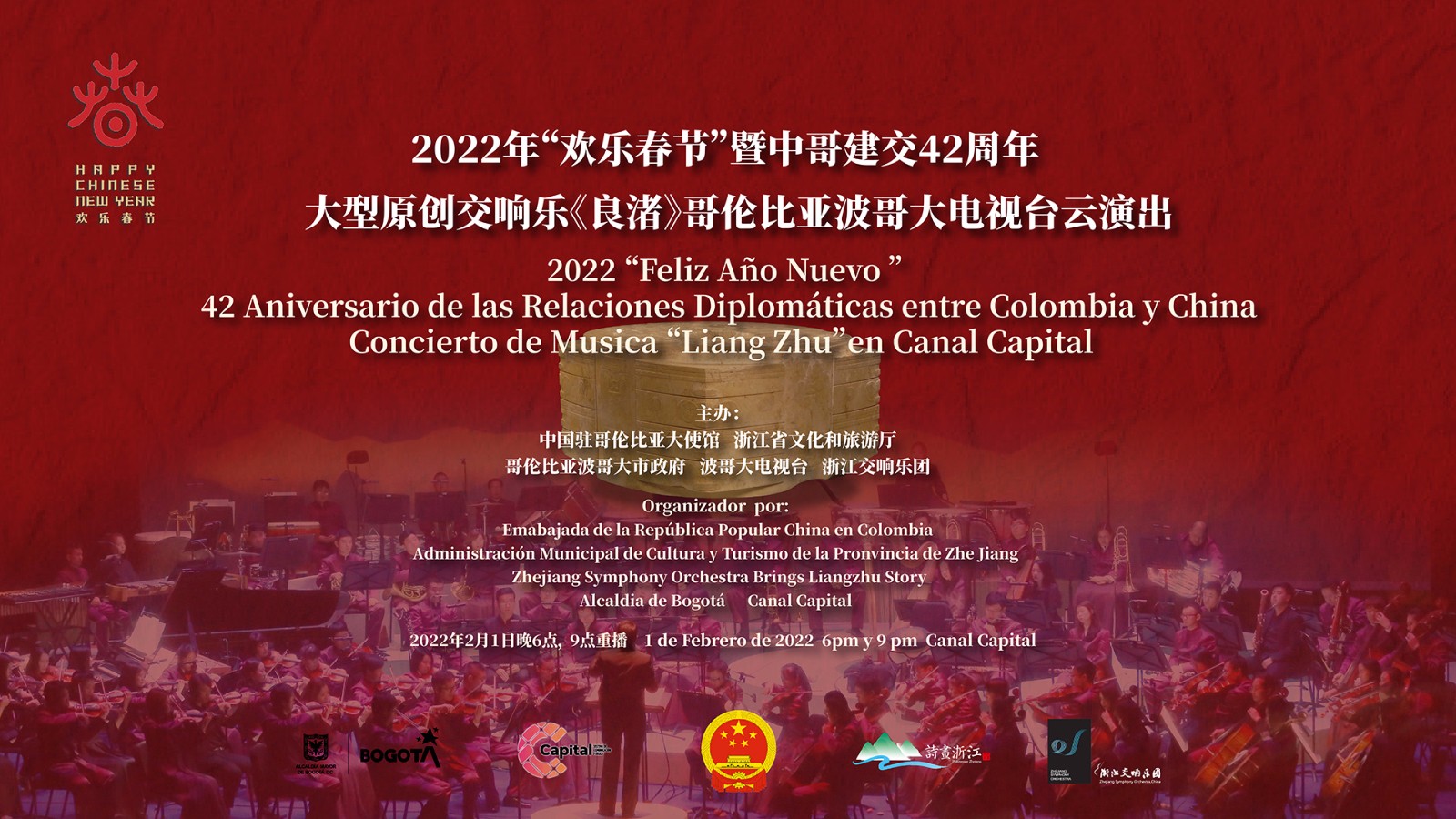 为庆祝中国壬寅虎年春节、北京冬奥会开幕及中哥建交42周年,由中国驻哥伦比亚使馆、浙江省文化和旅游厅与哥伦比亚文化部、波哥大市政府、国家电视台、波哥大电视台等单位共同举办的30多场虎年“欢乐春节”中国文化月活动精彩纷呈、好戏连台。交响乐《良渚》于2月1日大年初一晚6点和9点,两次登陆首都波哥大电视台,中华文明的源远流长与博大精深令15万当地观众直呼惊艳。