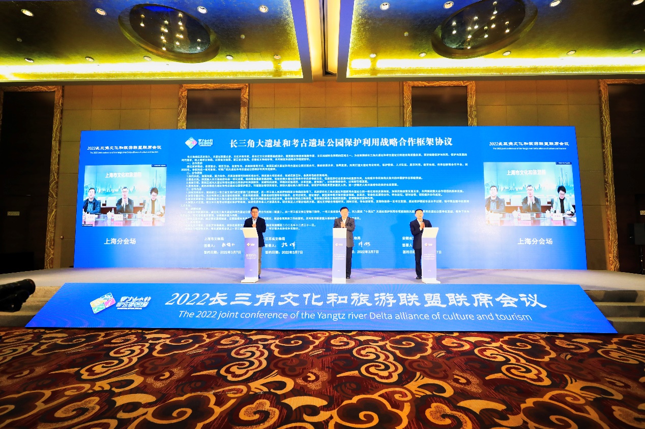 3月7日,2022年长三角文化和旅游联盟联席会议在安徽省黄山市召开,沪苏浙皖文化和旅游部门围绕长三角文化和旅游更高质量一体化发展深入交流会商(上海视频参会),共同签署成立长三角大遗址和考古遗址公园保护利用联盟。